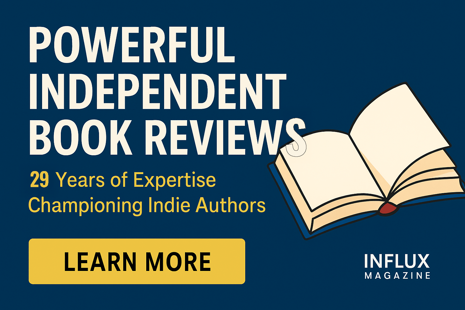 For nearly three decades, INFLUX Magazine has been a respected champion of Independent Book Reviews, giving indie authors a professional platform for fair, objective, and insightful literary coverage. Since 1997, we have supported independent writers with thoughtful critiques and in-depth interviews that stand proudly alongside conversations with bestselling authors.